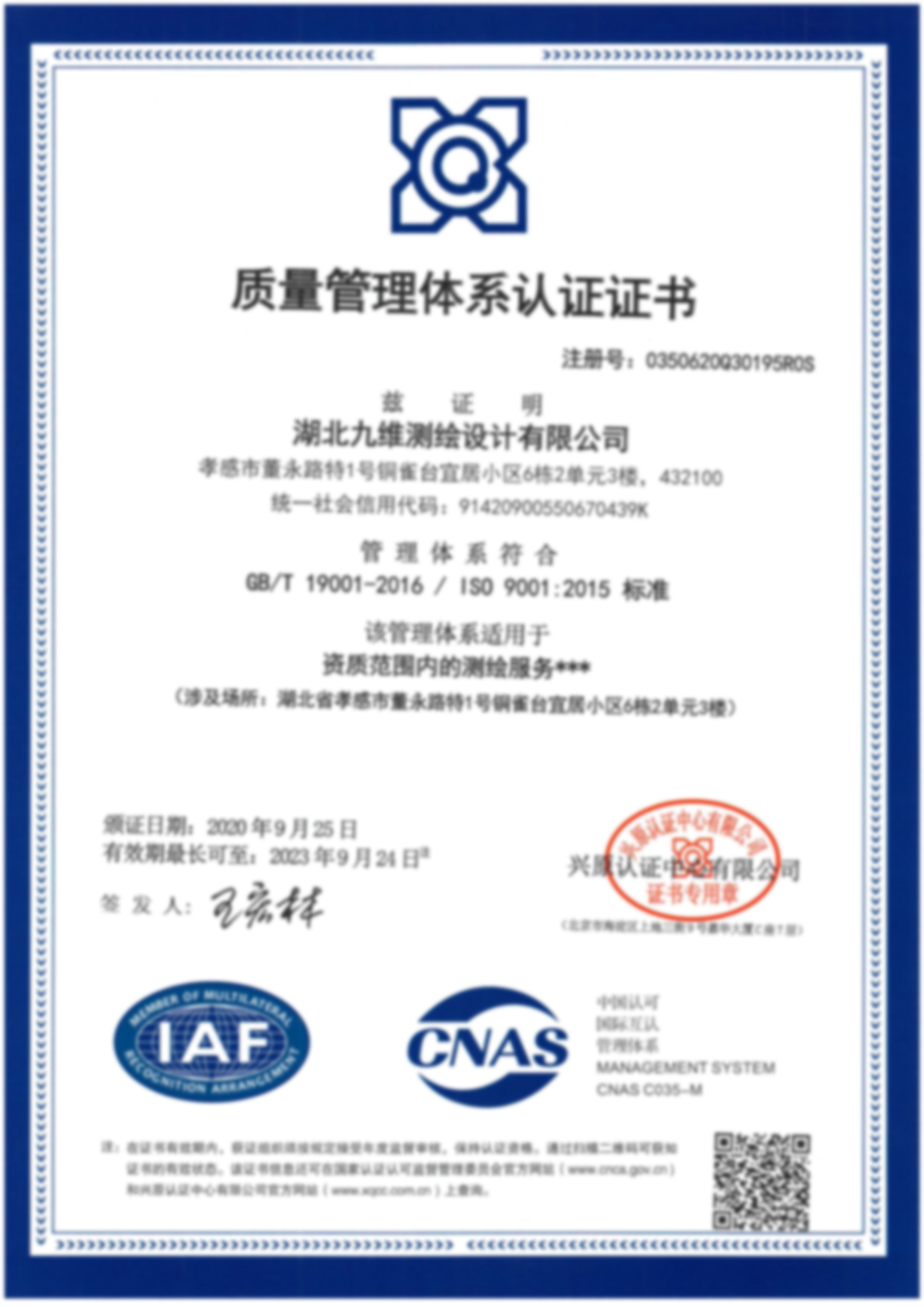 質(zhì)量管理體系認(rèn)證證書